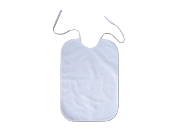 Babero reutilizable para adultos, con tejido tipo rizo en el frente e impermeable en el reverso (PV). Cuenta con cierre con cintas para un ajuste seguro alrededor del cuello.