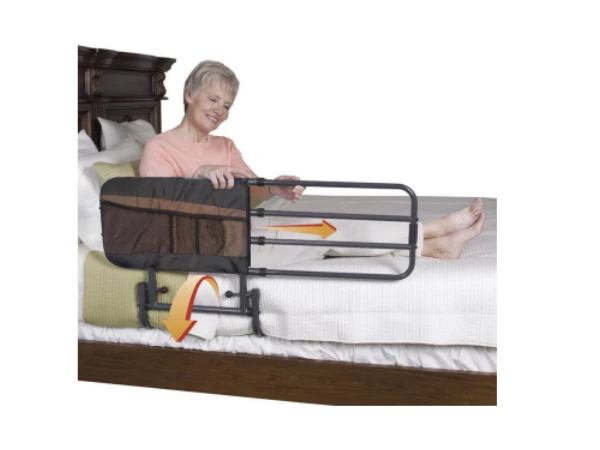 Barandilla diseñada para cama con longitud reducida, estructura extensible telescópica y función abatible. Ideal para prevenir caídas y facilitar la movilidad del usuario al entrar y salir de la cama.