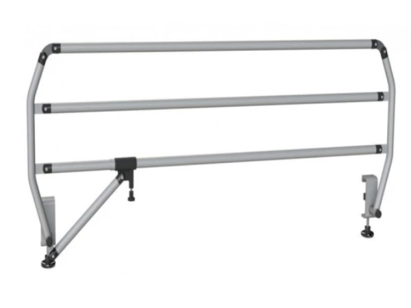 Barandillas abatibles de 90 cm de longitud total, diseñadas para camas clínicas o geriátricas. Con estructura metálica en acero, pintura epoxi, bisagras de nylon y anclaje universal que permite fijación tanto en anclaje ancho como estrecho.