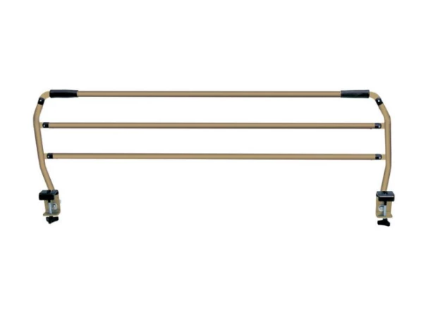 Par de barandillas abatibles de acero pintado, con tres barras horizontales, diseñadas para camas clínicas o geriátricas. Se elevan automáticamente al ser colocadas y se bajan mediante desbloqueo manual mediante pomo.