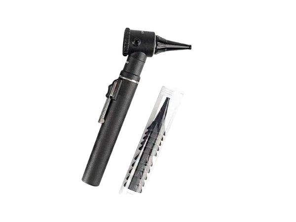 Incluye un tubo de plástico con espéculos auriculares reutilizables de 2,5 mm y 4 mm, compatibles con espéculos de otras marcas reconocidas. La lupa desmontable de 2,5 aumentos permite ampliar el campo visual y, al retirarla, facilita la inserción de instrumentos externos cuando el procedimiento lo requiere.