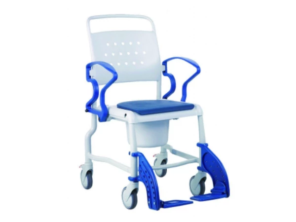 Silla de ducha/WC con orinal, asiento confort acolchado, respaldo ergonómico, reposabrazos abatibles, reposapiés desmontables y ruedas con freno. Hecha en materiales inoxidables, fácil de limpiar y de usar en ambientes húmedos.