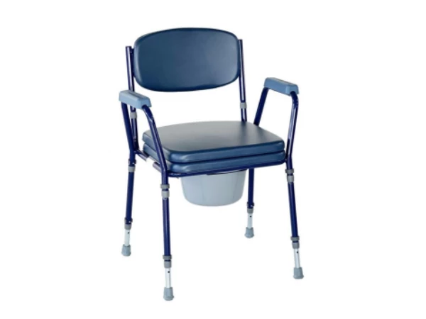 Silla de ducha con inodoro incorporado, discreta en diseño para integrarse al entorno del baño. Tiene una tapa que camufla el orificio cuando no se usa. El sistema de extracción de la cubeta se acciona levantando la tapa acolchada. Las patas son regulables para adaptar la altura al usuario. Asiento y respaldo blandos, impermeables para facilitar limpieza. La silla puede desmontarse sin herramientas para transportar o almacenar.