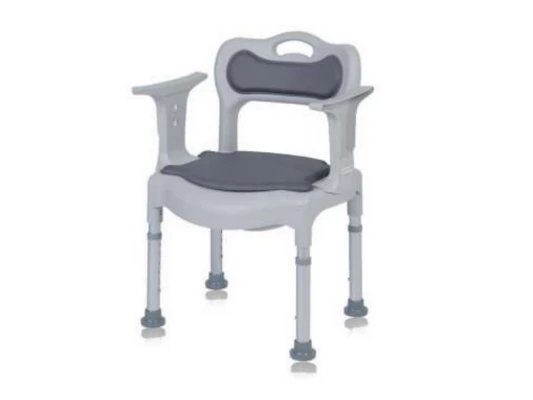 Silla para ducha/WC con respaldo acolchado cómodo y asiento acolchado. El asiento es extraíble para acceso a la cubeta. Altura regulable, reposabrazos extraíbles, patas con ventosas antideslizantes para seguridad.