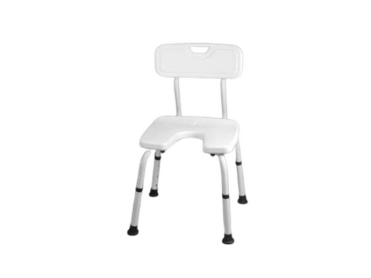 Silla de ducha con respaldo de plástico y asiento en forma de U (herradura), diseñada para facilitar la higiene íntima. Cuenta con patas extensibles para ajustar la altura y conteras de caucho que aportan estabilidad y seguridad en el baño.